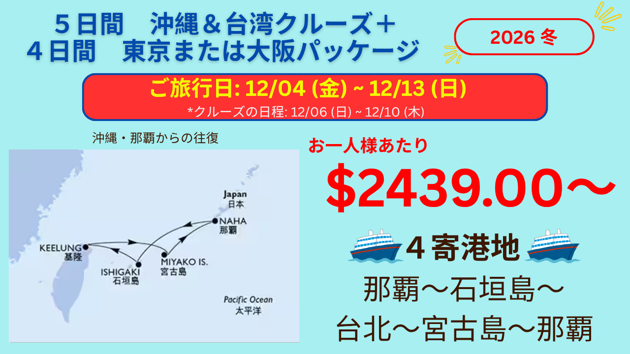 以上のクルーズのみのお値段に加え、航空券、ホテル、1日ツアー等