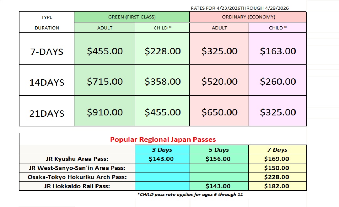 JAPAN RAIL PASS RATES FOR 4/23 - 4/29